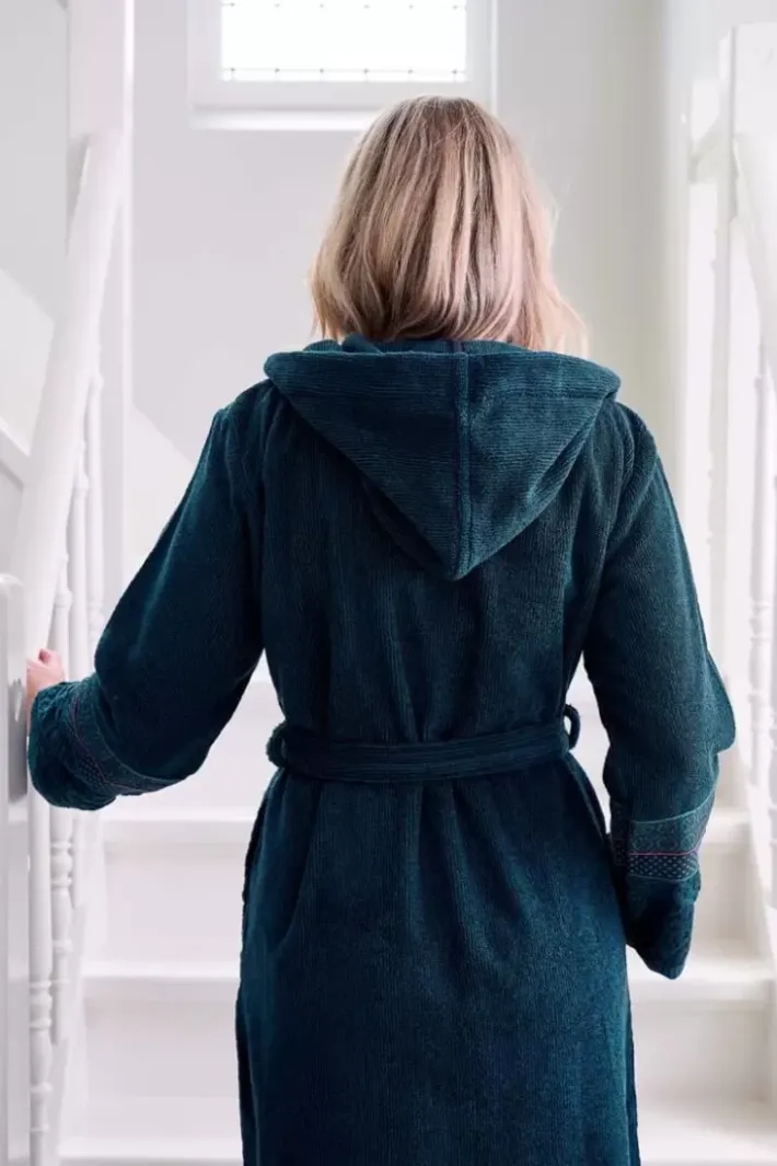 Fuhlen Sie Sich Im Dunkelblauen Soft Zellige Bademäntel Weich Und Bequem. Der Bademäntel Prasentiert Sich Mit Einem Dunkelblau-Blaugrunen Streifenmuster. An Den Armelenden Befinden Sich Drei Biesen In Den Farben Blaugrun Und Rosa. Dazwischen Sind Zwei Verschiedene Stilvolle Jacquardgewebte Blumenmuster In Den Farben Dunkelblau Und Blaugrun Zu Sehen. Daruber Hinaus Sind Die Armel Mit Einer Dunkelblau-Blaugrun Gestreiften Bordure Verziert. Der Bademäntel Hat Eine Kapuze Sowie Eingrifftaschen Und Wird Mit Einem Langen Gurtel Geschlossen. Der Soft Zellige Bademäntel Ist Aus Velours-Frottier Und Aus Einer Hochwertiger, Reiner Baumwolle Hergestellt, Wodurch Der Bademäntel Herlich Weich Anfuhlt Und Sorgt Fur Eine Gute Feuchtigkeitsaufnahme. Der Bademäntel Muss Vor Gebrauch Gemas Dem Beigefugte Pflegeetikett Gewaschen Werden.