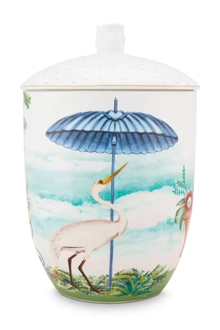 Dieses Schone Vorratsgefas Sorgt Fur Ein Naturliches Flair. Mit Dem Bewolkten Hintergrund Und Den Tropischen Pflanzen Konnen Sie Sich Vorstellen, Mitten In Der Natur Zu Sein. Auf Der Vorderseite Ist Ein Reiher Unter Einem Regenschirm Zu Sehen. Diese Tropische Stimmung Wird Mit Einem Weisen Deckel Und Bunten Blumen Kombiniert. Kombinieren Sie Dieses Vorratsgefas Mit Anderen Artikeln Unserer Jolie-Kollektion Fur Ein Umwerfendes Ergebnis.