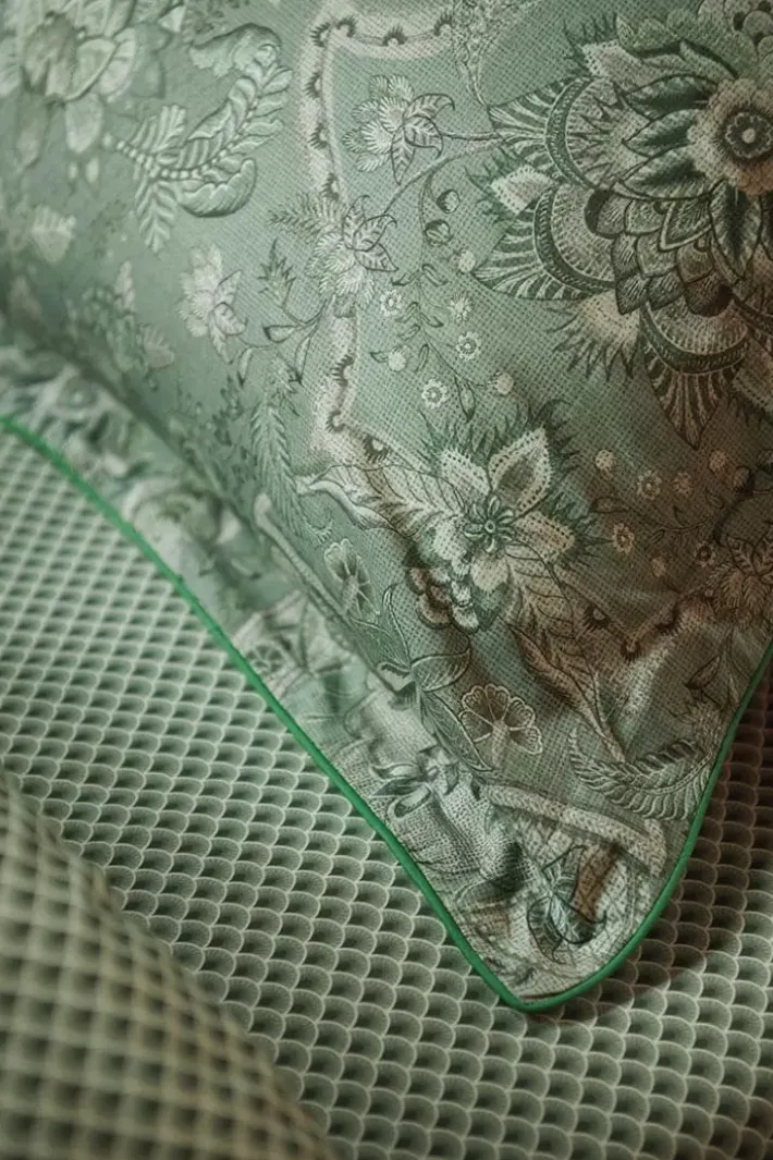 Dieser Kissenbezug In Grun Ist Mit Dem Kyoto Nights-Design Bedruckt. Dieser Print Besteht Aus Symmetrisch Angeordneten Blumen Und Ornamenten, Die In Einem Hellen Mittelteil Mit Dunkleren Seitenstreifen Angeordnet Sind. Der Kissenbezug Hat Einen Gesteppten Rand, Einen Knopfverschluss Und Ist Mit Einer Farbe Paspel Versehen. Die Ruckseite Ist Mit Einem Bogenmuster Bedruckt, So Dass Der Kissbezug Beidseitig Verwendet Werden Kann.