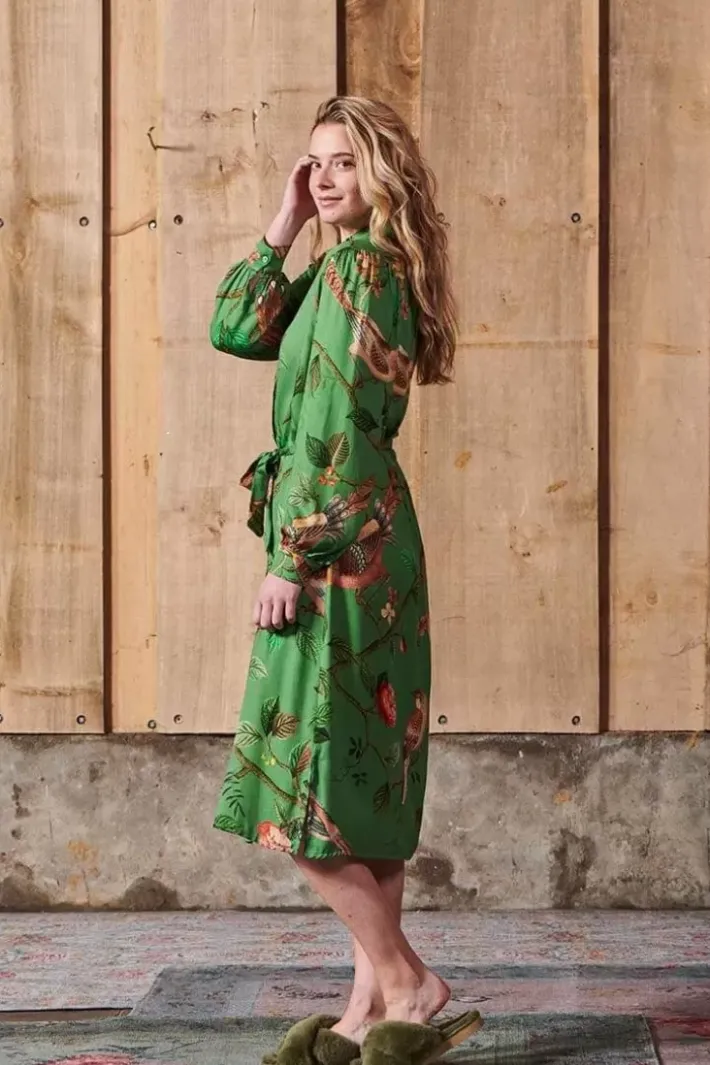 Dieses Kleid In Grun Ist Mit Dem Uppigen Good Nightingale Design Versehen. Das Sich Wiederholende Blumenmuster Besteht Aus Einer Variation Fantasievoller Chintzblumen Und Vogeln. V-Ausschnitt Mit Passenden Knopfen.
