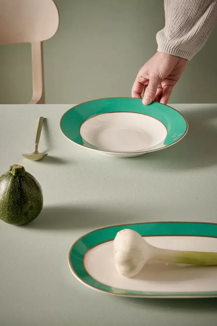 Ein Ovaler Tortenteller In Den Farben Grun Und Weis Aus Der Kollektion Pip Chic. Der Grune Kuchenteller Ist Mit Goldenen Randern Verziert, Die Fur Ein Luxurioses Aussehen Sorgen. Das Porzellan Besteht Aus Bone China, Einem Hochwertigen, Dunnen Porzellan Mit Einem Raffinierten Design. Sie Konnen Es Perfekt Mit Dem Rest Unserer Pip Chique-Kollektion Mischen Und Kombinieren.