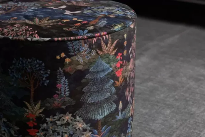 Der Pip Garden Hocker Medium In Dunkelblau Strahlt Etwas Marchenhaftes Aus. Das Design Bezaubert Durch Eine Vielfalt Fantasievoller Baume, Bunter Blumen Und Prachtiger Vogel. Kombinieren Sie Den Hocker Mit Dem Passenden Dunkelblauen Pip Garden Teppich, Um Einen Magischen Ort Zu Schaffen. Der Hocker Dient Als Extra Sitzgelegenheit Oder Hocker Zum Hochlegen Ihrer Beine.