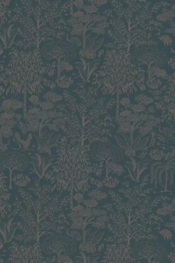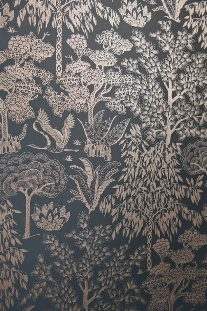 Gib Deinem Zuhause Ein Zauberhaftes Makeover Mit Der Wunderschonen Origami Tapete In Der Farbe Dunkelblau/Rosegold. Das Design Hat Ein Sich Wiederholendes Muster Aus Stilisierten Baumen Und Vogeln. Der Matte Hintergrund Mit Metallic-Print Verleiht Der Tapete Einen Besonderen Und Raffinierten Look. Die Origami Tapete Ist In Verschiedenen Farben Erhaltlich: Hellgrun/Silber, Ocker/Gold, Terra/Rosegold Und Gebrochen Weiss/Silber.
