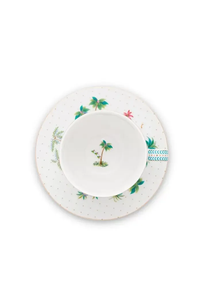 Dieses Set Aus Weiser Tasse Und Untertasse Entfuhrt Sie Mit Seinem Tropischen Design Auf Eine Tropische Insel. Die Tassen Sind Mit Einem Exotischen Muster Versehen. Die Untertassen Sind Mit Goldenen Punkten Dekoriert Und Haben Blaue Details. Man Erkennt Verschiedene Pflanzen, Bunte Blumen Und Arten. Dieses Set Hat Die Perfekte Grose Fur Eine Leckere Tasse Kaffee.