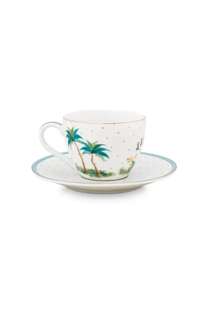 Dieses Set Aus Weiser Espressotasse Und Untertasse Entfuhrt Sie Mit Seinem Tropischen Design Auf Eine Tropische Insel. Die Tassen Sind Mit Goldenen Punkten Dekoriert Und Haben Blaue Details. Die Untertassen Sind Mit Einem Exotischen Muster Versehen. Man Erkennt Verschiedene Pflanzen, Bunte Blumen Und Arten. Dieses Set Hat Die Ideale Grose Fur Eine Kleine Tasse Kaffee.