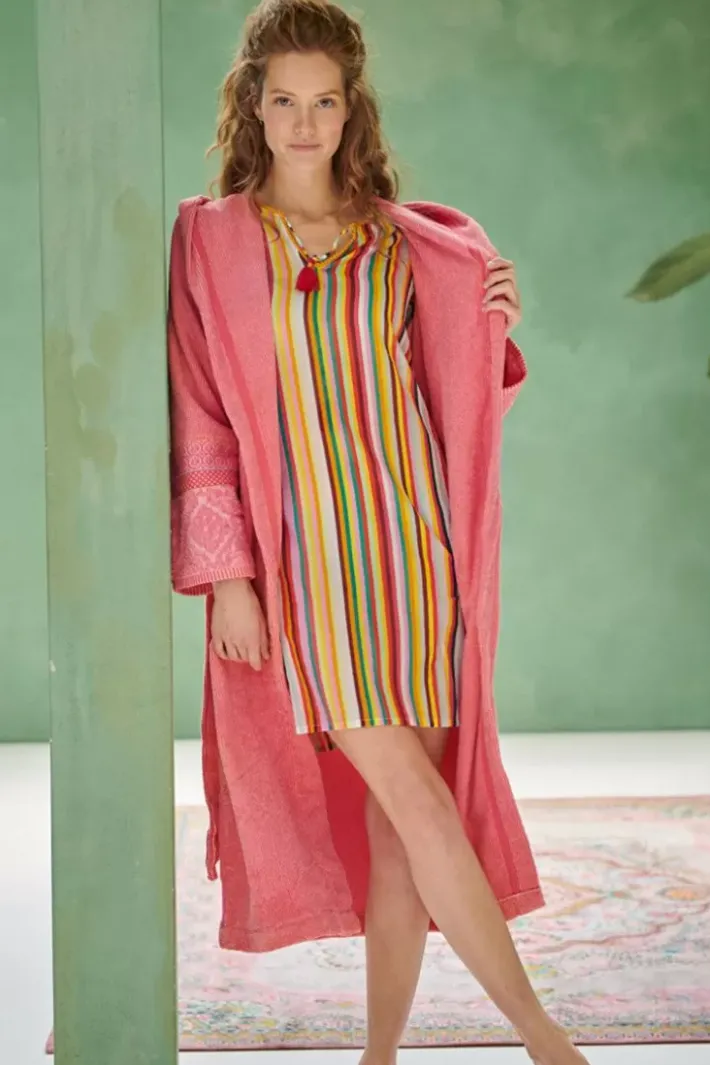 Dieser Lange Korallrosafarbene Bademäntel Stammt Aus Der Soft Zellige Kollektion Mit Feinen Streifen. Die Armel Sind Mit Gelben Und Blauen Paspeln Und Einem Jacquard-Motiv Versehen. Der Bademäntel Hat Eingrifftaschen Und Eine Kapuze. Der Bademäntel Muss Vor Gebrauch Gemas Dem Beigefugte Pflegeetikett Gewaschen Werden.