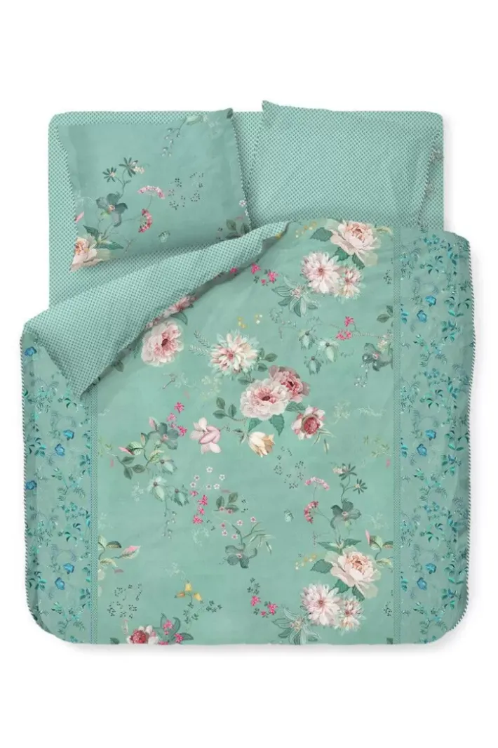 Das Grune Blumenmuster Auf Dem Bettbezug Tokyo Bouquet Ist Ein Aufdruck Mit Grosen, Eleganten Fantasieblumen Und Kleinen Blumenzweigen. Der Gesamte Aufdruck Enthalt Ein Subtiles Muster, Das Noch Mehr Tiefe Verleiht. An Verschiedenen Stellen Sind Uberraschende, Figurative Elemente Wie Alte Schlussel Und Musiknoten Versteckt. Die Seitenbahnen Sind Mit Kleineren Blumen In Den Gleichen Farbtonen Versehen Und Durch Einen Geometrischen Aufdruck Getrennt. Ein Prachtiger Blickfang Fur Ihr Schlafzimmer. Auf Der Ruckseite Befindet Sich Ein Muster Aus Stilisierten Bogen.
