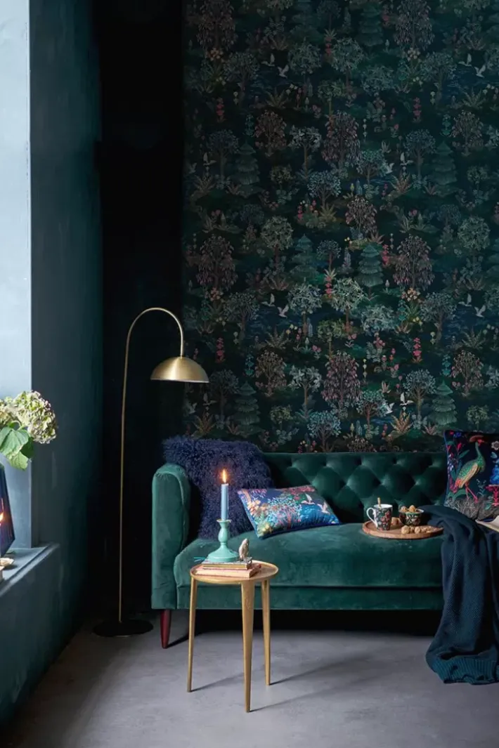 Gib Deinem Zuhause Ein Zauberhaftes Makeover Mit Der Wunderschonen Pip Garden Wallpower. Das Design Besteht Aus Einem Marchenhaften Baumprint Mit Einem Hintergrund Aus Tiefblauen Und Grunen Farbtonen. Kraniche Fliegen Durch Eine Landschaft Aus Handgemalten Baumen Und Pflanzen Uber Die Versteckten Moore.