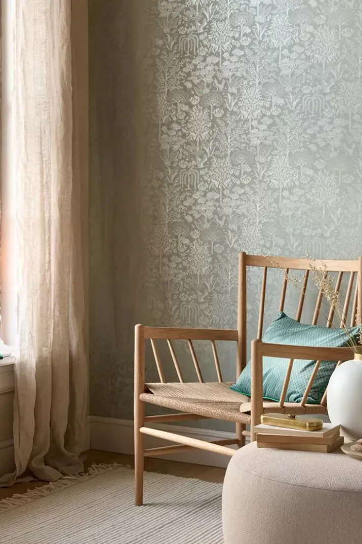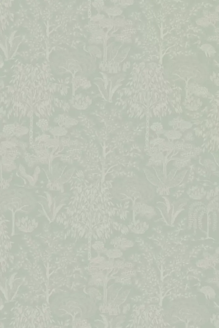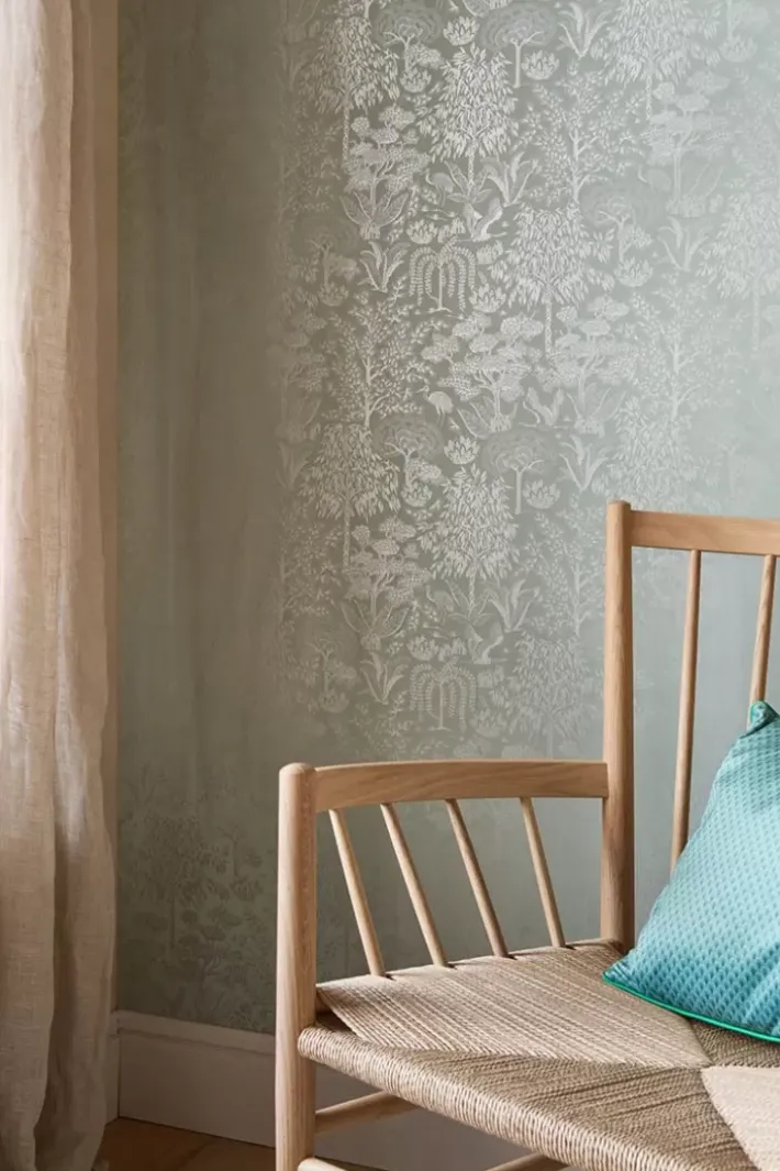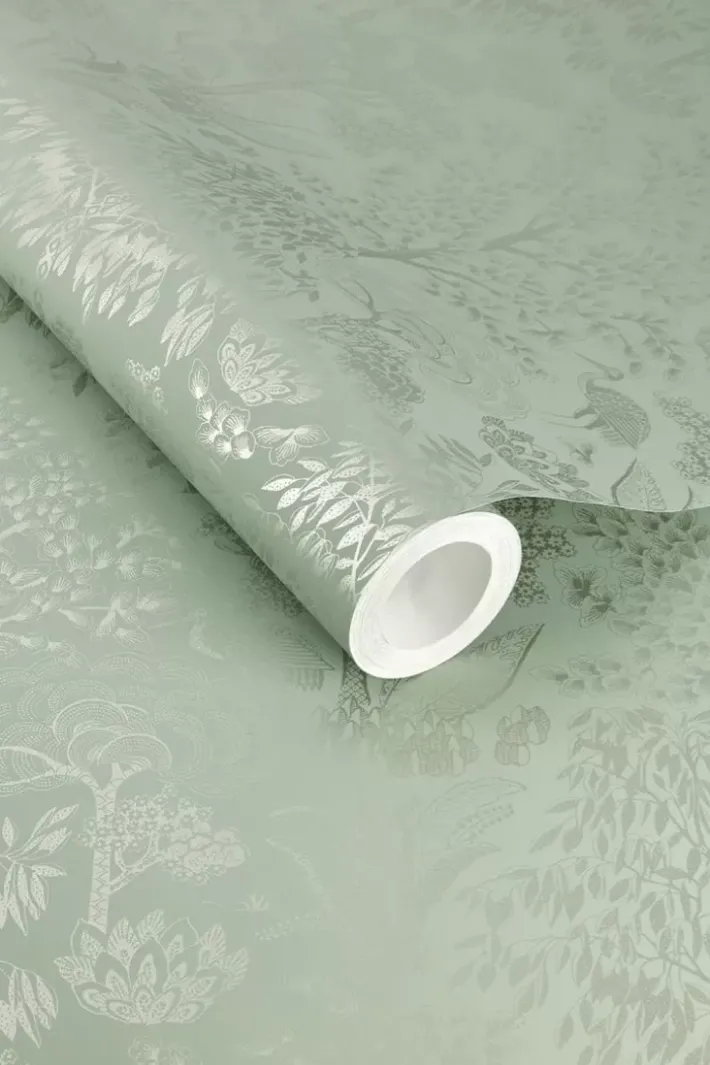 Gib Deinem Zuhause Ein Zauberhaftes Makeover Mit Der Wunderschonen Origami Tapete In Der Farbe Hellgrun/Silber. Das Design Hat Ein Sich Wiederholendes Muster Aus Stilisierten Baumen Und Vogeln. Der Matte Hintergrund Mit Metallic-Print Verleiht Der Tapete Einen Besonderen Und Raffinierten Look. Die Origami Tapete Ist In Verschiedenen Farben Erhaltlich: Gebrochen Weiss/Silber, Ocker/Gold, Terra/Rosegold Und Dunkelblau/Rosegold.