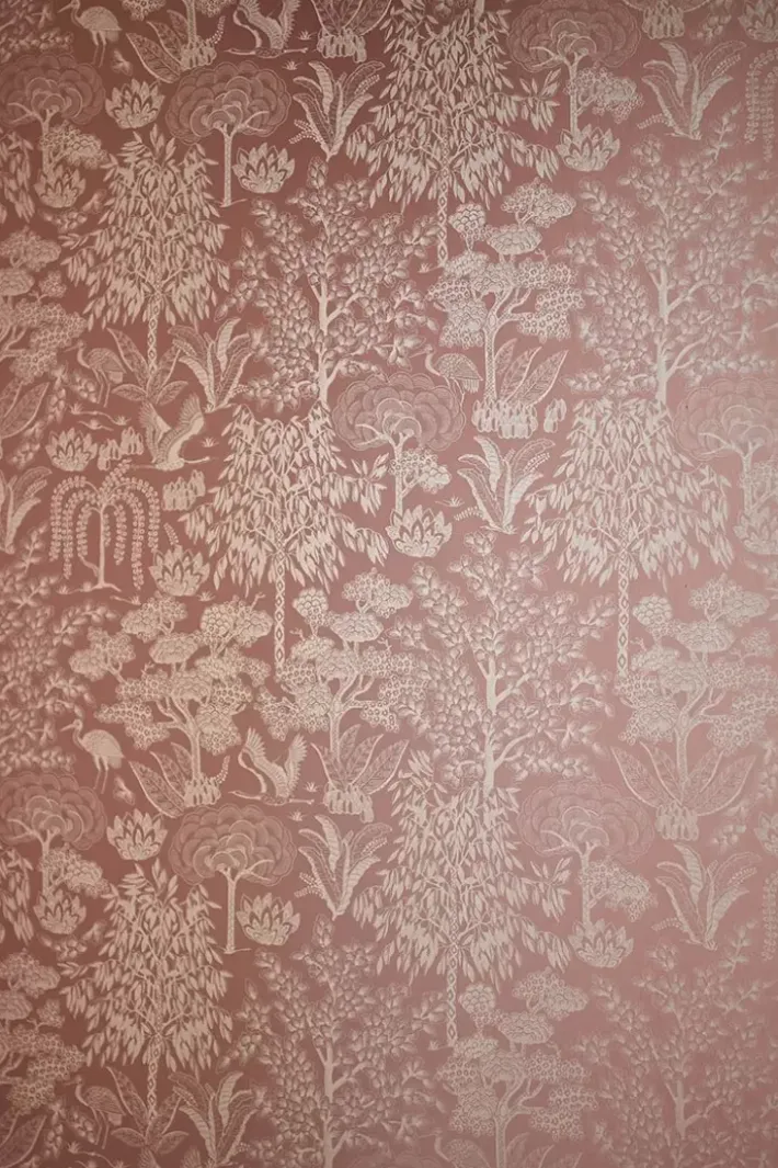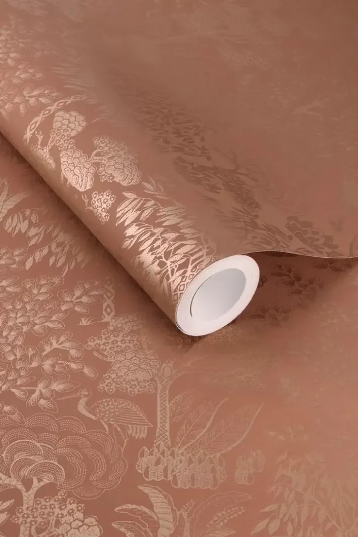 Gib Deinem Zuhause Ein Zauberhaftes Makeover Mit Der Wunderschonen Origami Tapete In Der Farbe Terra/Rosegold. Das Design Hat Ein Sich Wiederholendes Muster Aus Stilisierten Baumen Und Vogeln. Der Matte Hintergrund Mit Metallic-Print Verleiht Der Tapete Einen Besonderen Und Raffinierten Look. Die Origami Tapete Ist In Verschiedenen Farben Erhaltlich: Hellgrun/Silber, Ocker/Gold, Gebrochen Weiss/Silber Und Dunkelblau/Rosegold.