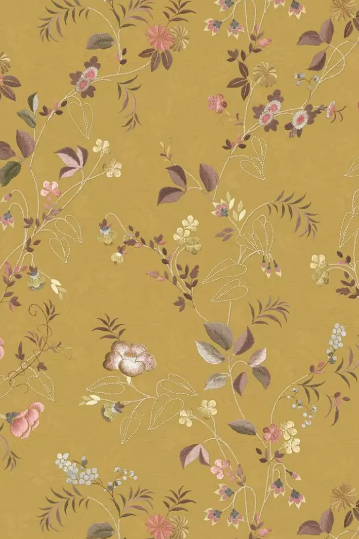 Gib Deinem Zuhause Ein Zauberhaftes Makeover Mit Der Wunderschonen Tokyo Blossom Tapete In Der Farbe Senfgelb. Das Design Hat Einen Detaillierten Print Aus Kleinen, Pastellfarbenen Bluten Und Blattern, Die Wie Gestickt Aussehen. Die Farben Des Kissenbezugs Sind Zart Mit Subtilen Farbakzenten. Der Hintergrund Hat Eine Gedruckte, Glanzende Textur, So Dass Diese Tapete Wie Echte Seide Wirkt. Die Tokyo Blossom Tapete Ist In Verschiedenen Farben Erhaltlich: Jade Grun, Sand, Khaki Und Rosa Mauve.