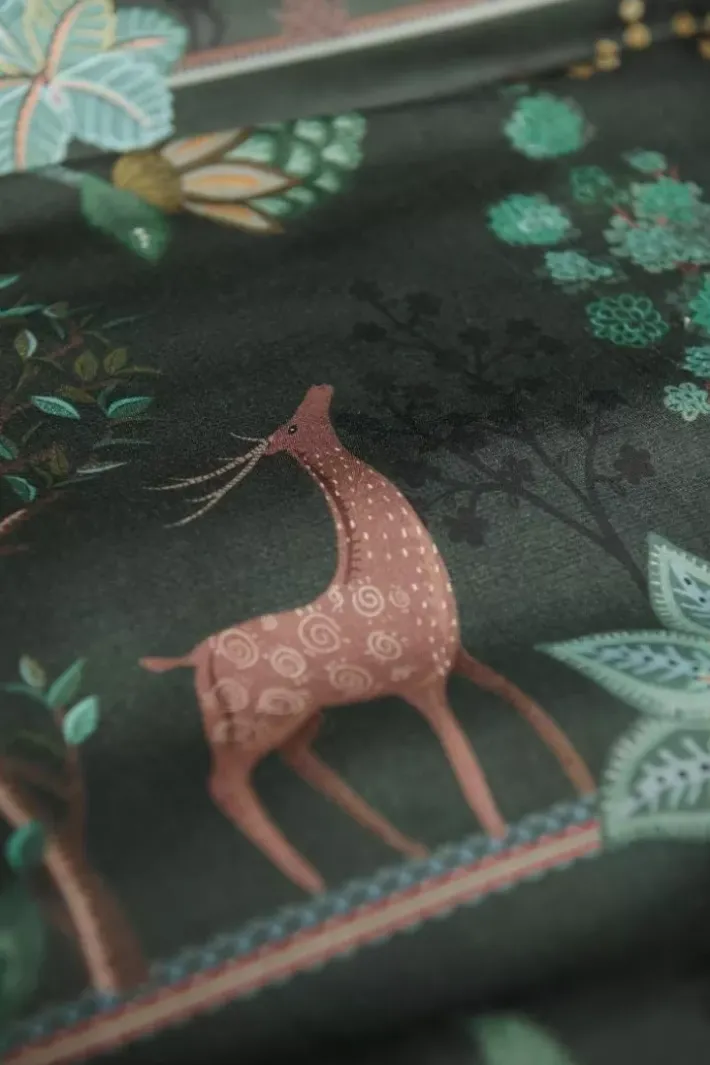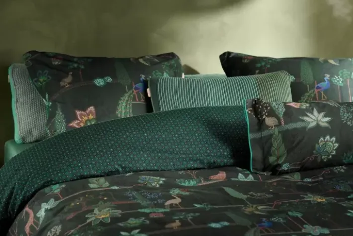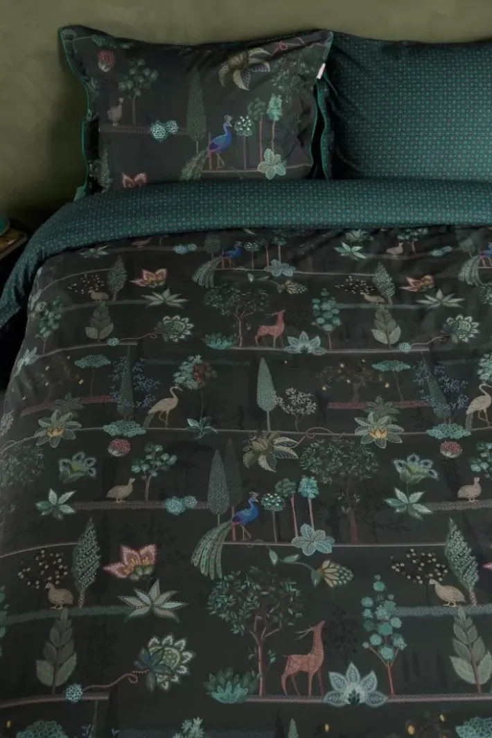 Die Bettwasche Alberi Zeigt Einen Wunderschonen Landschaftsdruck Voller Uberraschender Details. Wachteln Sitzen Unter Feigenbaumen, Pfauen Stehen Neben Toskanischen Zypressen Und Ein Vogel Stibitzt Eine Zitrone Aus Einem Baum. Der Tief Dunkelgrune Untergrund Mit Kobaltblauen Akzenten Verleiht Dieser Bettwasche Eine Besonders Stimmungsvolle Ausstrahlung.