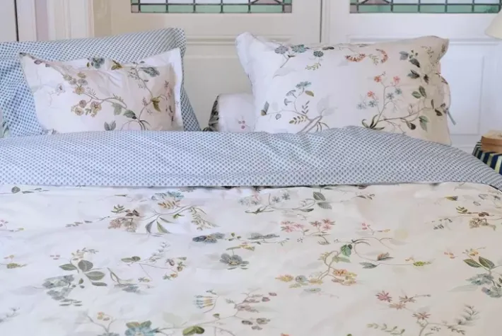 Das Florale Design Des Weisen Quadratkissens Kawai Flower Besteht Aus Anmutigen Zweigen, Auf Denen Fantasievolle Butterblumen, Mohnblumen, Anemonen Und Sumpfdotterblumen Wachsen. Die Blumen Und Blatter Haben Uberraschende Farbkombinationen, Die Diesem Klassischen Design Eine Moderne Note Verleihen. Auf Der Ruckseite Befindet Sich Ein Kleiner Schleifenaufdruck. Das Dekorative Kissen Hat An Den Seiten Eine Gesteppte Oxford-Kante, Die Ihm Einen Luxuriosen Look Verleiht. Das Kissen Kann Beidseitig Verwendet Werden.