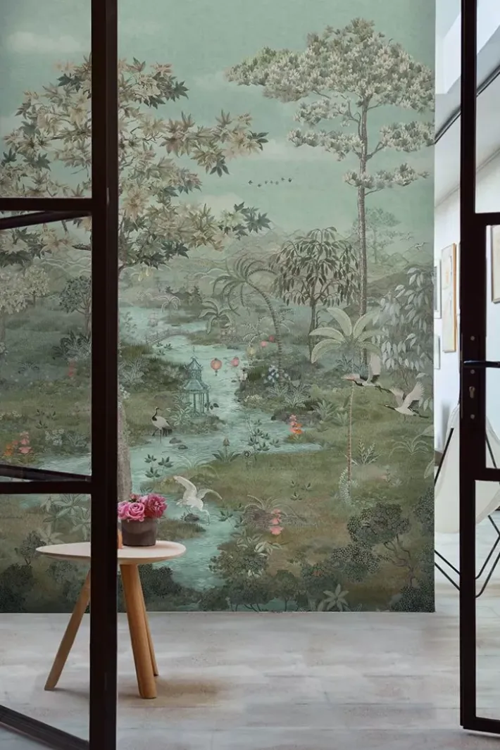 Gib Deinem Zuhause Ein Zauberhaftes Makeover Mit Der Wunderschonen Pip Paradise Wallpower. Das Design Ist Von Den Wunderschonen Landschaften Japans Inspiriert. Auf Dem Exotischen Panorama Ist Eine Zartgrune Landschaft Zu Sehen, Durch Die Ein Fluss Fliest. Am Ufer Zwischen Den Palmen Und Feldern Finden Sie Kraniche Und Fischende Reiher. Der Hintergrund Geht In Stilisierte Berge Uber, Zwischen Denen Pagoden Auftauchen. Ein Exotisches Bild Zum Traumen!
