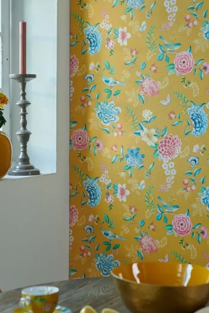 Was Macht Das Gelbe Good Evening Design Zu Einem Hingucker An Ihrer Wand? Das Blumenmuster Good Evening Ist Ein Wunderschones Grosartiges Design Auf Vinyl Mit Bunten Blumen Und Tropischen Vogeln. Der Druck Ist Von Traditionellen Orientalischen Wandgemalden Inspiriert. Aufgrund Der Struktur Der Tapete Sieht Es Fast Wie Ein Schoner Stoff Aus, Der Auf Die Wand Aufgetragen Wurde. Das Good Evening-Design Lasst Sich Leicht Mit Fast Allen Anderen Designs Aus Der Kollektion Kombinieren Und Sorgt Fur Einen Schonen Mix & Match-Effekt. Die Pip Studio Good Evening Tapete Ist In Verschiedenen Farben Wie Gelb, Weis, Sand, Benzin, Hellblau, Rot Und Grun Erhaltlich Und Schafft Eine Frohliche Atmosphare In Ihrem Zuhause.