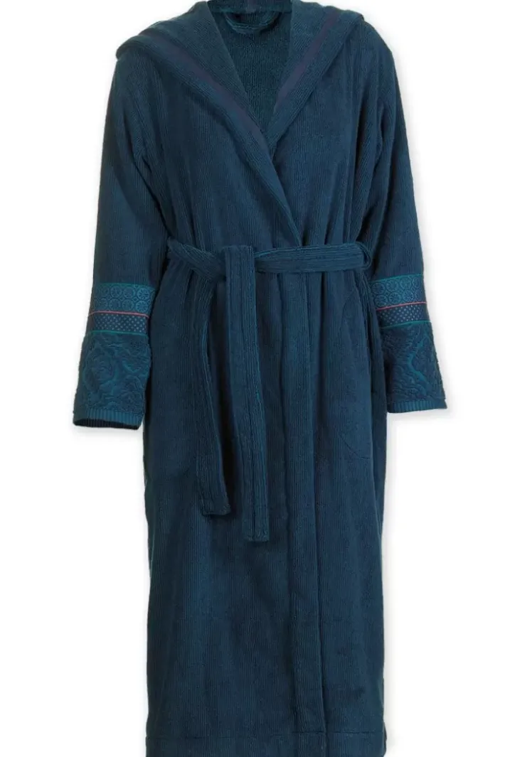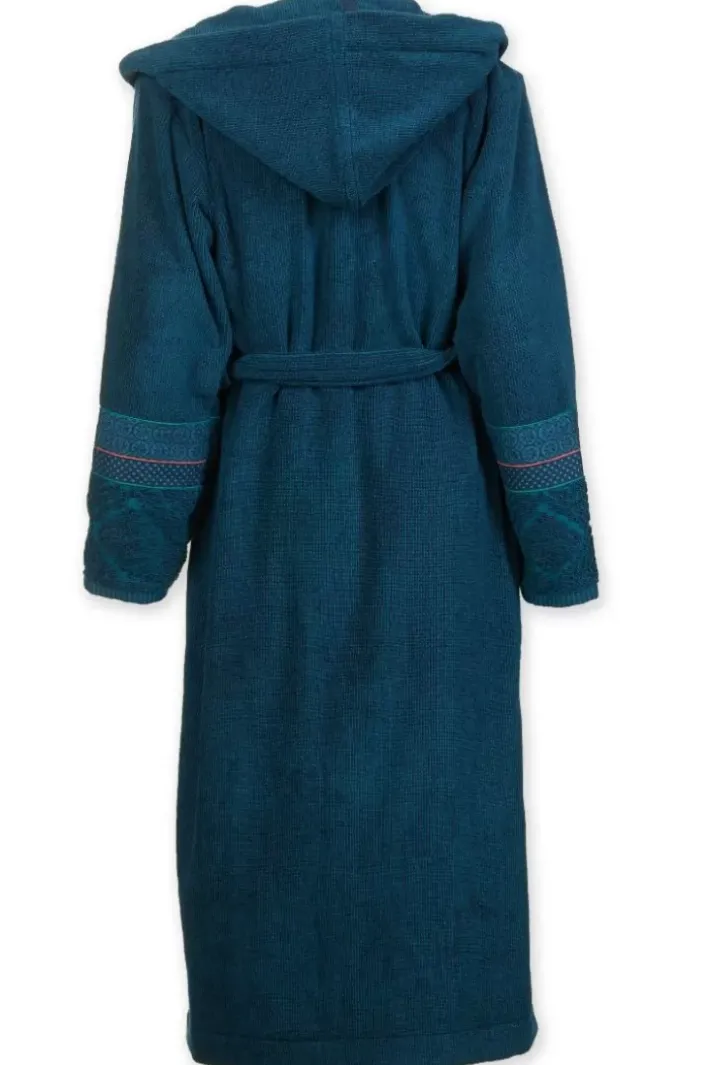 Fuhlen Sie Sich Im Dunkelblauen Soft Zellige Bademäntel Weich Und Bequem. Der Bademäntel Prasentiert Sich Mit Einem Dunkelblau-Blaugrunen Streifenmuster. An Den Armelenden Befinden Sich Drei Biesen In Den Farben Blaugrun Und Rosa. Dazwischen Sind Zwei Verschiedene Stilvolle Jacquardgewebte Blumenmuster In Den Farben Dunkelblau Und Blaugrun Zu Sehen. Daruber Hinaus Sind Die Armel Mit Einer Dunkelblau-Blaugrun Gestreiften Bordure Verziert. Der Bademäntel Hat Eine Kapuze Sowie Eingrifftaschen Und Wird Mit Einem Langen Gurtel Geschlossen. Der Soft Zellige Bademäntel Ist Aus Velours-Frottier Und Aus Einer Hochwertiger, Reiner Baumwolle Hergestellt, Wodurch Der Bademäntel Herlich Weich Anfuhlt Und Sorgt Fur Eine Gute Feuchtigkeitsaufnahme. Der Bademäntel Muss Vor Gebrauch Gemas Dem Beigefugte Pflegeetikett Gewaschen Werden.