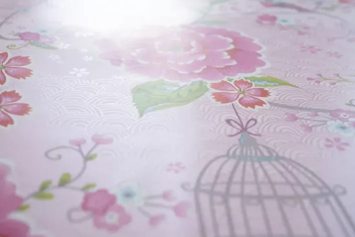 Diese Hellrosa Tapete Mit Birds In Paradise Print Ist Mit Einem Himmeldessin Mit Vogeln, Vogelkafigen Und Ausgearbeiteten Rosafarbenen Blumen Versehen.