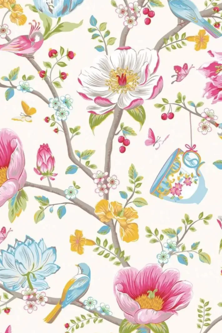 Diese Weise Tapete Mit Chinese Garden Dessin Hat Ein Detailliertes Muster Mit Zierlichen Rosen Und Blumenknospen, Paradiesvogeln Und Stilisierten Blutenzweigen.