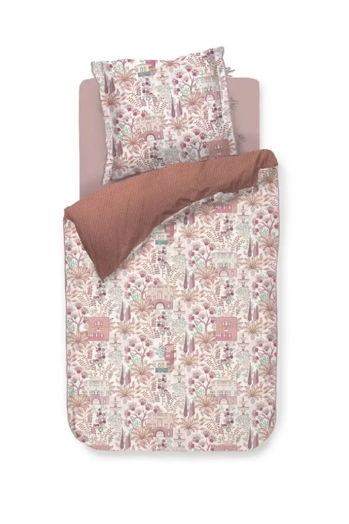 Die Bettwasche Casa Di Pip Schmuckt Ein Frohliches Printmuster Mit Diversen Dekorierten Italienischen Hausern. Die Hauser Stehen Inmitten Von Zypressen, Feigenbaumen Und Eleganten Springbrunnen.