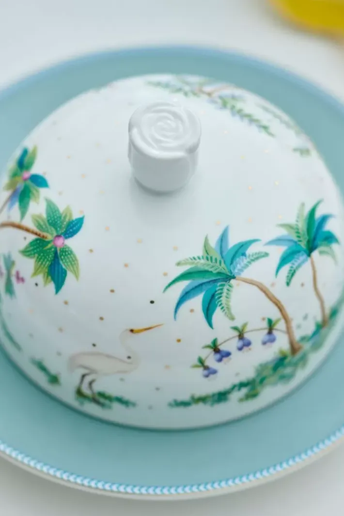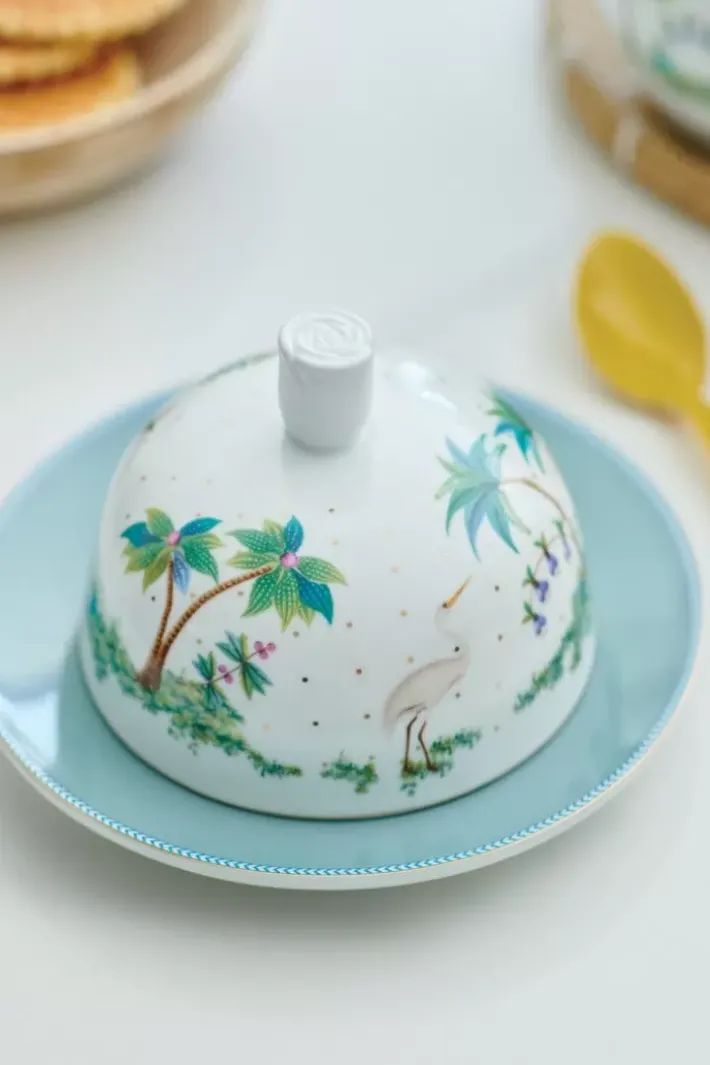Diese Tropische Butterdose Aus Unserer Jolie-Kollektion Wird Ihren Tisch Im Handumdrehen Verschonern. Die Butterdose Ist Mit Goldenen Punkten Verziert Und Zeigt Ein Muster Aus Verschiedenen Tropischen Pflanzen, Baumen Und Exotischen Arten. Die Platte Hat Einen Blauen Hintergrund Und Passt Perfekt Zum Deckel. Kombinieren Sie Diese Butterdose Mit Anderen Teilen Unserer Jolie-Kollektion Fur Einen Elegant Gedeckten Tisch.