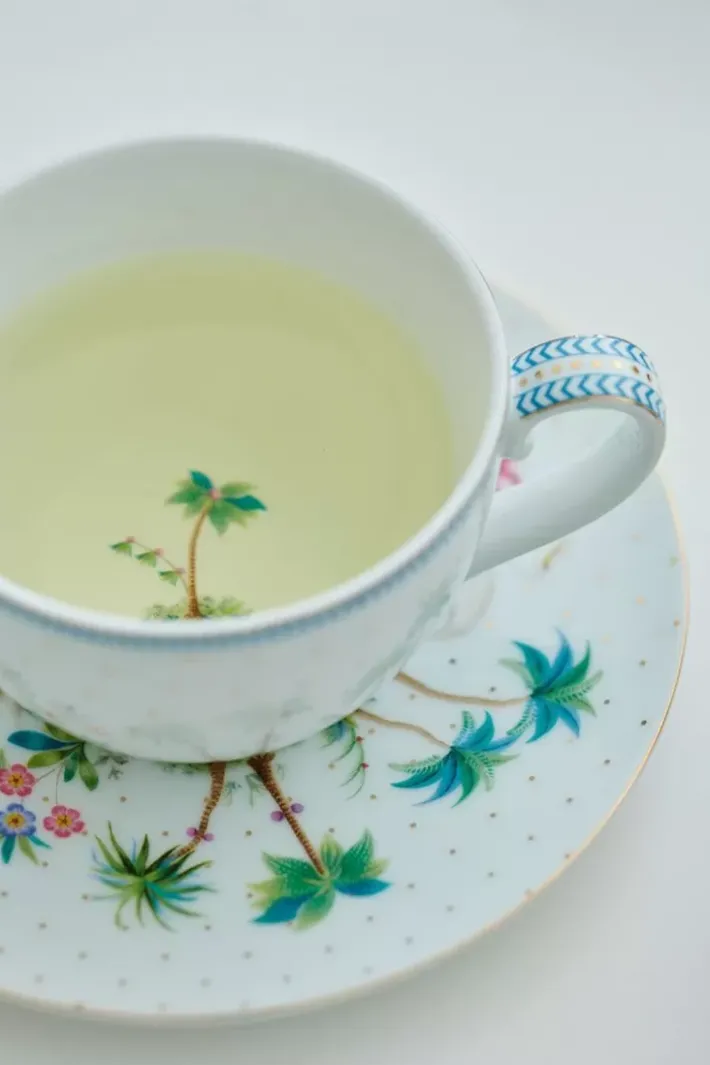 Dieses Set Aus Weiser Tasse Und Untertasse Entfuhrt Sie Mit Seinem Tropischen Design Auf Eine Tropische Insel. Die Tassen Sind Mit Einem Exotischen Muster Versehen. Die Untertassen Sind Mit Goldenen Punkten Dekoriert Und Haben Blaue Details. Man Erkennt Verschiedene Pflanzen, Bunte Blumen Und Arten. Dieses Set Hat Die Perfekte Grose Fur Eine Leckere Tasse Kaffee.