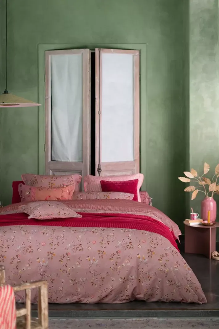 Das Frohliche, Hellrosa Quadratische Zierkissen Tokyo Blossom Hat Einen Detaillierten Print Aus Kleinen, Pastellfarbenen Bluten Und Blattern, Die Wie Gestickt Aussehen. Die Farben Des Kissenbezugs Sind Zart Mit Subtilen Farbakzenten. Der Untergrund Hat Eine Rosafarbene, Gedruckte Leinenstruktur.