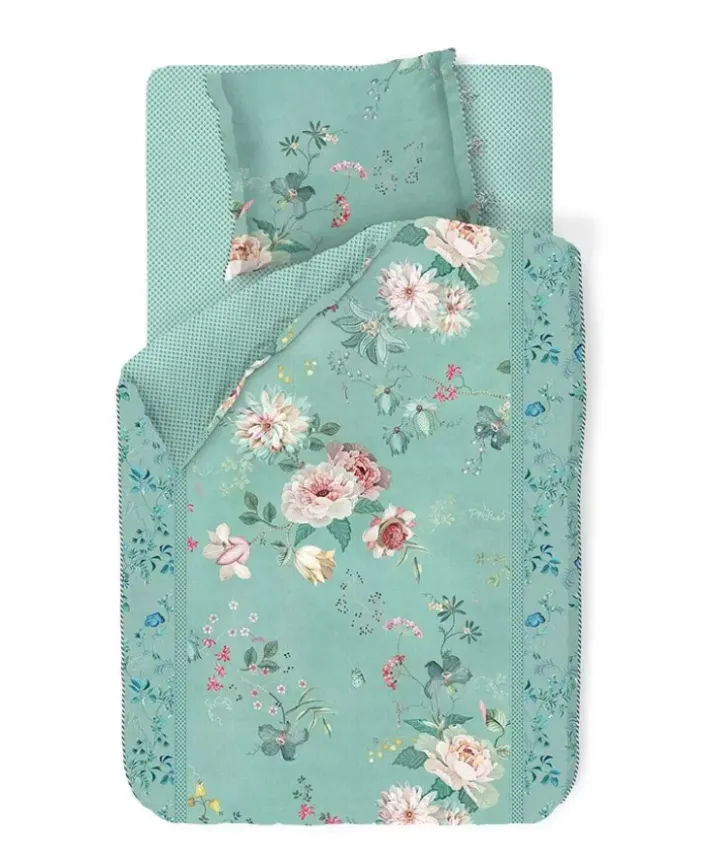 Das Grune Blumenmuster Auf Dem Bettbezug Tokyo Bouquet Ist Ein Aufdruck Mit Grosen, Eleganten Fantasieblumen Und Kleinen Blumenzweigen. Der Gesamte Aufdruck Enthalt Ein Subtiles Muster, Das Noch Mehr Tiefe Verleiht. An Verschiedenen Stellen Sind Uberraschende, Figurative Elemente Wie Alte Schlussel Und Musiknoten Versteckt. Die Seitenbahnen Sind Mit Kleineren Blumen In Den Gleichen Farbtonen Versehen Und Durch Einen Geometrischen Aufdruck Getrennt. Ein Prachtiger Blickfang Fur Ihr Schlafzimmer. Auf Der Ruckseite Befindet Sich Ein Muster Aus Stilisierten Bogen.