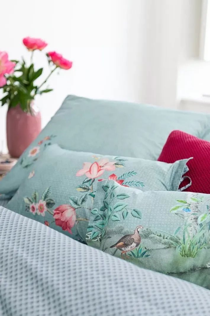 Dieser Romantische Okinawa Kissenbezug Ist Von Orientalischen Chinoiserie-Prints Inspiriert. Japanische Bluten Verzieren Diesen Kissenbezug. Die Zarte, Blaue Farbe Dieses Zierkissens Sorgt Fur Eine Ruhige Aber Dennoch Elegante Ausstrahlung Auf Ihrem Bett.