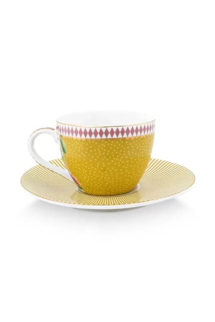 Diese Espresso Tasse & Untertasse Sind Mit Einem Gelb Dessin, Exotischen Blumen Und Goldenen Details Verziert. Lasst Sich Hervorragend Mit Dem Ubrigen Geschirr Aus Der La Majorelle Kollektion Kombinieren.