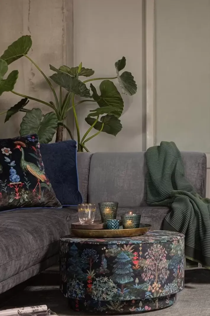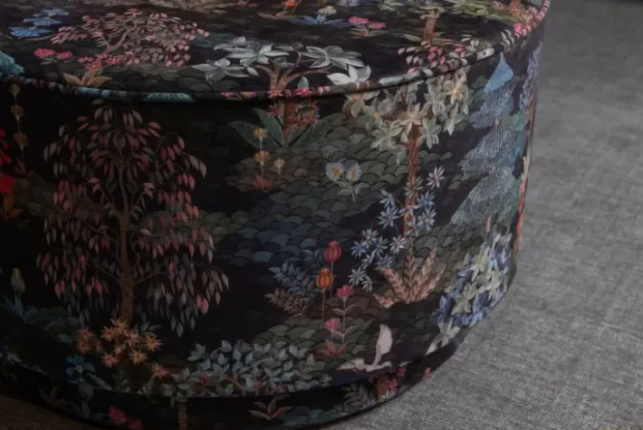 Der Pip Garden Hocker Large In Dunkelblau Strahlt Etwas Marchenhaftes Aus. Das Design Bezaubert Durch Eine Vielfalt Fantasievoller Baume, Bunter Blumen Und Prachtiger Vogel. Kombinieren Sie Den Hocker Mit Dem Passenden Dunkelblauen Pip Garden Teppich, Um Einen Magischen Ort Zu Schaffen. Der Hocker Dient Als Extra Sitzgelegenheit Oder Hocker Zum Hochlegen Ihrer Beine.