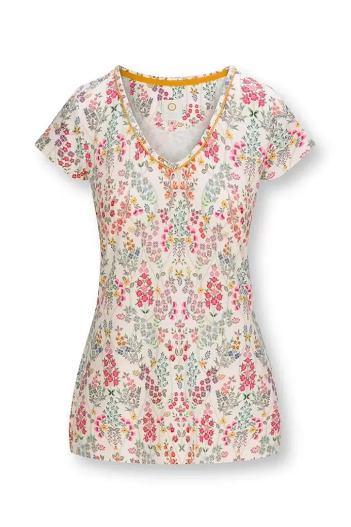 Mochten Sie Einen Lassigen, Aber Modischen Look? Dann Ist Dieses Bequeme Toy-Top In Weis Das Perfekte Basic-Item, Um Lagen Zu Kreieren. Aus Viskose Und Elasthan, Was Das Top Wunderbar Weich Und Dehnbar Macht. Das Weise Top Ist Mit Dem Primavera-Design Verziert Und Eignet Sich Perfekt Fur Unterschiedliche Casual-Styles. Neben Dem Muster Sorgt Der V-Ausschnitt Fur Den Letzten Schliff. Kombiniere Dieses Top Mit Artikeln Aus Der Neuen Homewear-Kollektion Fur Eine Schone Kombination.