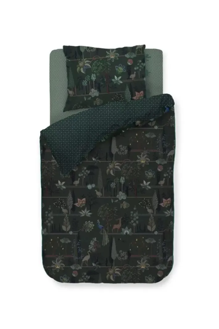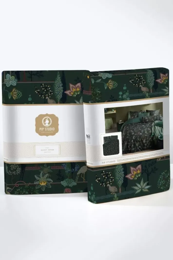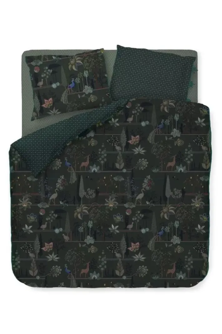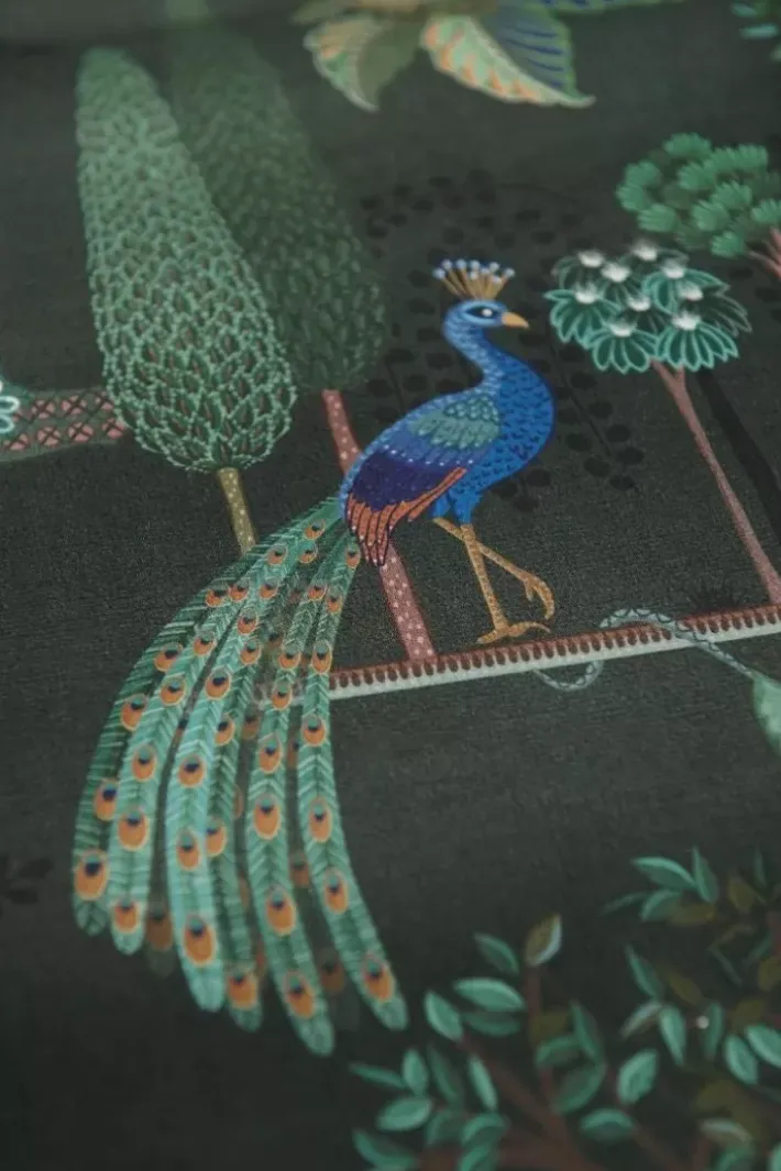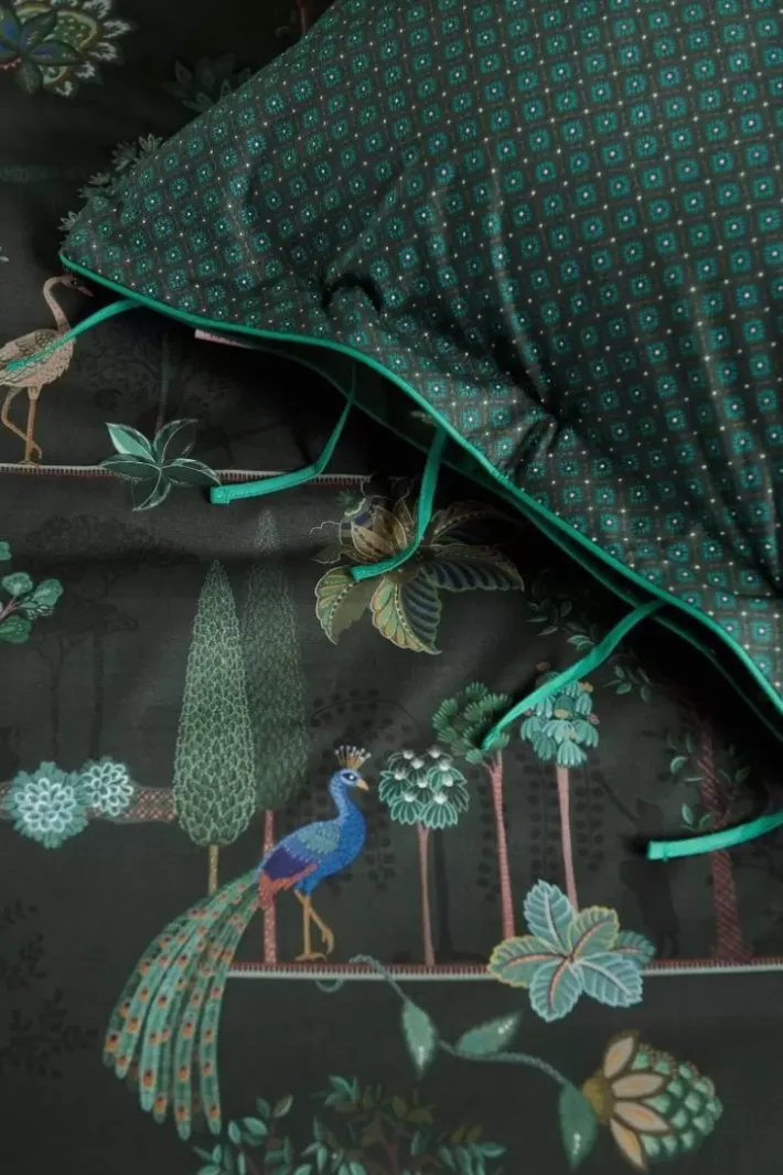 Die Bettwasche Alberi Zeigt Einen Wunderschonen Landschaftsdruck Voller Uberraschender Details. Wachteln Sitzen Unter Feigenbaumen, Pfauen Stehen Neben Toskanischen Zypressen Und Ein Vogel Stibitzt Eine Zitrone Aus Einem Baum. Der Tief Dunkelgrune Untergrund Mit Kobaltblauen Akzenten Verleiht Dieser Bettwasche Eine Besonders Stimmungsvolle Ausstrahlung.