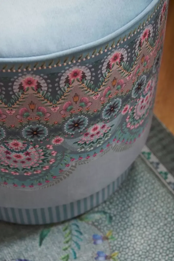 Der Medium Blau Majorelle Hocker Schafft Eine Besondere Atmosphare Im Haus. Das Design Ist Von Den Antiken Und Traditionellen Teppichen Des Fernen Ostens Inspiriert. Dieses Item Ist Ein Echter Blickfang. Die Farbigen Verzierungen Auf Dem Zartgrunen Hintergrund Verleihen Diesem Hocker Eine Vintage-Ausstrahlung Und Einen Eleganten Twist. Der Hocker Passt Perfekt Zu Unserem Majorelle By Pip Teppich Blau. Der Hocker Dient Als Extra Sitzgelegenheit Oder Hocker Zum Hochlegen Ihrer Beine.