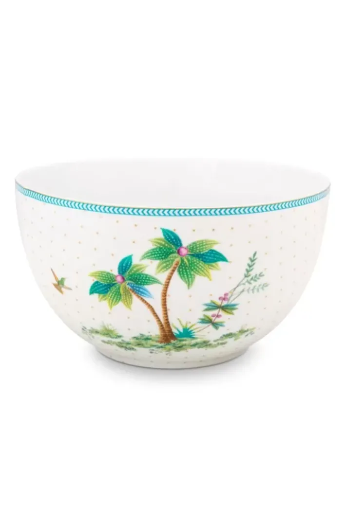 Diese Schone Schale Hat Einen Weisen Hintergrund Mit Goldenen Punkten Und Blauen Details. Am Rand Befindet Sich Eine Blaue Linie. Ausen An Der Schale Befinden Sich Verschiedene Exotische Pflanzen Und Palmen, So Dass Man Sich Gleich Wie In Den Tropen Fuhlt. Auch In 15 Cm Erhaltlich. Fur Inspirationen Zum Kombinieren Dieser Schale Beachten Sie Bitte Unsere Jolie-Kollektion.