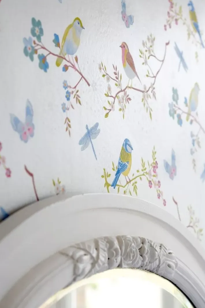 Verleihen Sie Ihrem Interieur Einen Verspielten Twist Mit Dieser Cremefarbenen Early Bird Tapete. Das Muster Aus Farbenfrohen Vogeln, Blumenzweigen Und Schmetterlingen Verwandelt Jedes Zimmer In Einen Eleganten Raum.